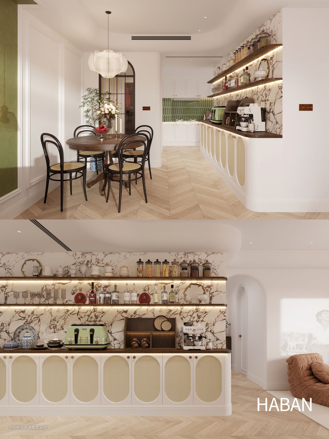 靠次墙设计整排3.7米长餐边柜与置物架,黑胡桃木台面、宝格丽大理石背板、藤编柜门将餐边柜的颜值拉满。
