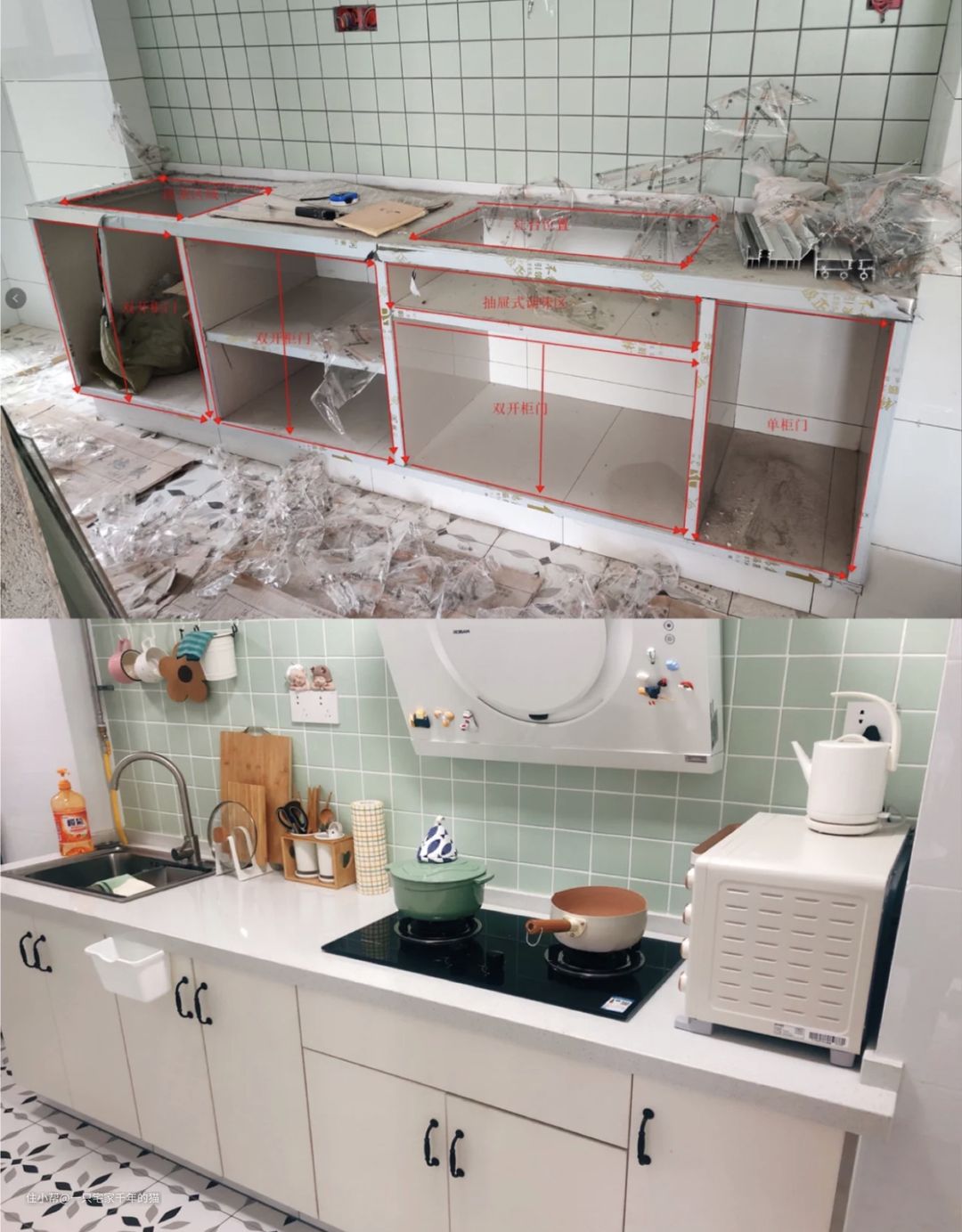 抱着反正没钱就试一试的态度,让师傅帮我砌了个橱柜,入住3个月了没想到越用越顺心,无论谁见了都要夸一夸,原本花一万多的厨房,二千元就搞定了。