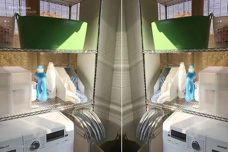 为了省钱,我从市场了买了一个非常普通的几十元置物架,就是那种可以调节层板高度的不锈钢架子,下面根据洗衣机的高度来调节好,正好把洗衣机塞进去,上边还可以用来置物,既省钱又实用,相比较几千元的洗衣机柜,这种设计方法简直就约等于不花钱的零成本设计。