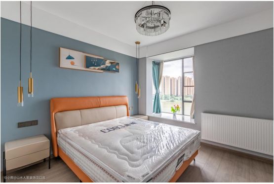 主卧的背景墙依旧是墙布造型,浅浅的蓝色,淡泊而清远。床头则做了一个跳色搭配,愈加活跃了室内空间。两边配有吊灯,金色质感照出莹莹的光。