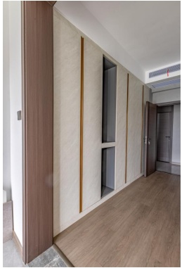 从主卧进门口开始,直接一面墙都打了衣柜。而靠近床头一侧也打了一面薄柜,整体收纳格外充足。衣柜全部采用的是多层板柜体,柜门是欧松板。一门到顶,柜门背后要加拉直器,防止变形。