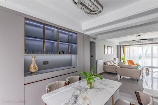 餐边柜是在传统设计的基础上,运用到一些玻璃门和嵌入灯带元素,显得很有氛围感。加上整面墙都做了到顶柜体,拥有极强的储物性能。金色框架的点缀,精致之余给酒柜带来些许神秘之感。