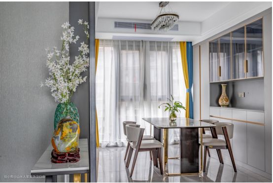 因为是一体化客餐厅,在视觉上保持了空间的层次感,整体采光相对不错。搭配蓝黄两色窗帘,浓烈而又深沉,加上纱帘布料自身的垂感,展现出自然利落的美感。借助于精心设计的细节和功能,更好地装扮空间紧凑的餐厅,显得整洁又大方。