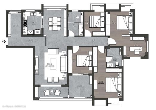 业主需求:业主是一家三口加父母偶尔居住,每个人的房间都要极具特色,包括主卧、次卧和书房在内,同时还想要一个专属的休闲娱乐空间。又因为大阳台临湖,希望整体设计有湖景房该有的风范及魅力。