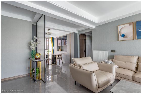 在过道与客厅的交界处,合理放置了玻璃隔断,避免过道光景一览无遗。玻璃磨砂的质感,潜藏的美若隐若现。此处的端景台更是起到锦上添花的作用,进而填补了空间的单调,通过摆放绿植、装饰品等物,相应提升过道的精致度。