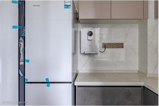 厨房不大,特意挤出一个80cm宽的冰箱位,内凹入墙,就在进门口区域。使用白色大理石纹理墙砖后,采光度更高。上下柜互相呼应,又和冰箱关联。特别需要注意的是插座的预留位置,台面与吊柜之间的插座要远离水槽的位置,冰箱的插座最好设定在正墙一侧或上侧。