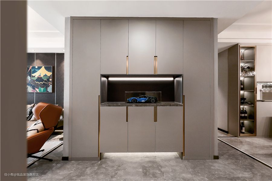 入口门位于客厅和餐厅中间,一般选择入口门两侧的鞋柜,同时作为餐厅的隔断,既有鞋柜存储功能,又有隔断装饰功能,区分功能区空间。