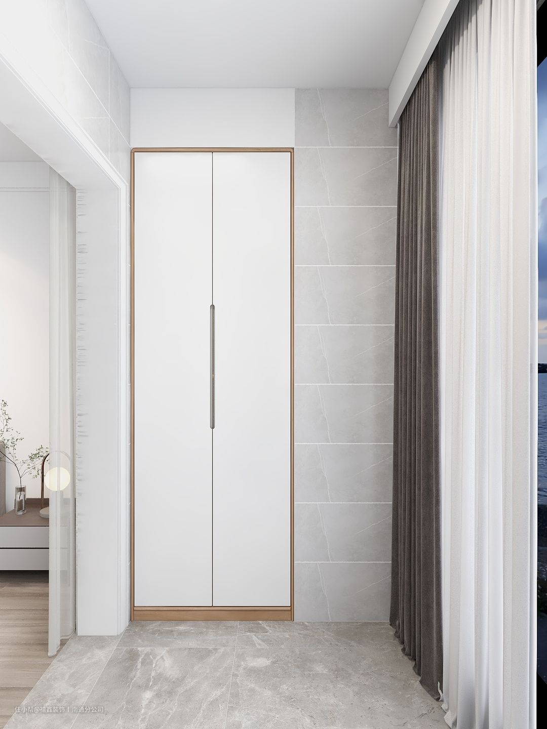 【阳台】主卧自带的小阳台有着巨大的落地窗,提供极佳的光线。为了保护隐私,添加了灰白拼色的窗帘。墙体内嵌入了一个双开门的衣柜,不占多余的地面空间,还增加了收纳空间。