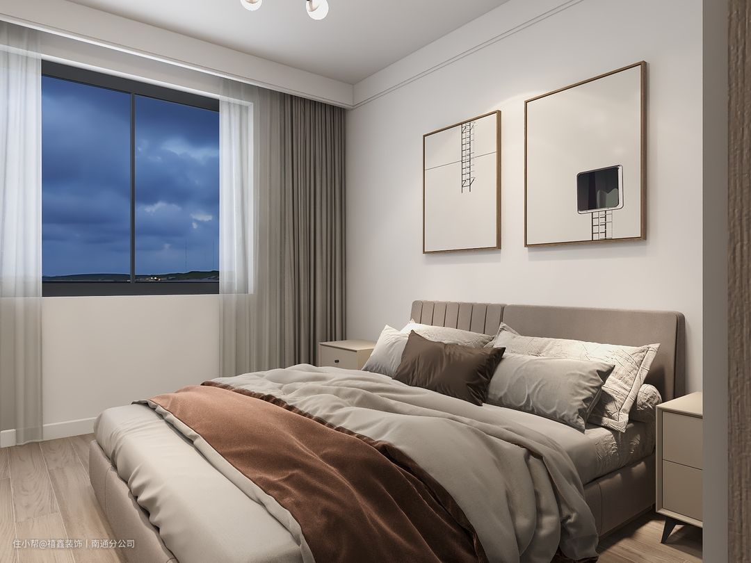 【次卧】次卧沿用主卧的风格和色调,双人床柔软舒适,在床头做了一些设计,纵向线条的切割带来了丰富的层次感。