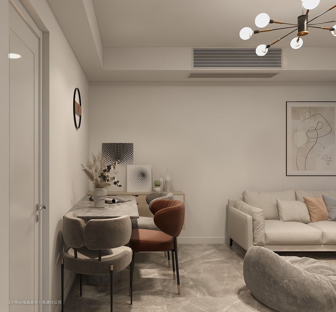 【餐厅】餐厅设置在沙发旁,留下一条过道,两个区域紧密串联。餐桌贴墙摆放,可容下3-4人同时用餐。餐椅是半包裹形式的,带有弧度的靠背带来更好的用餐体验。