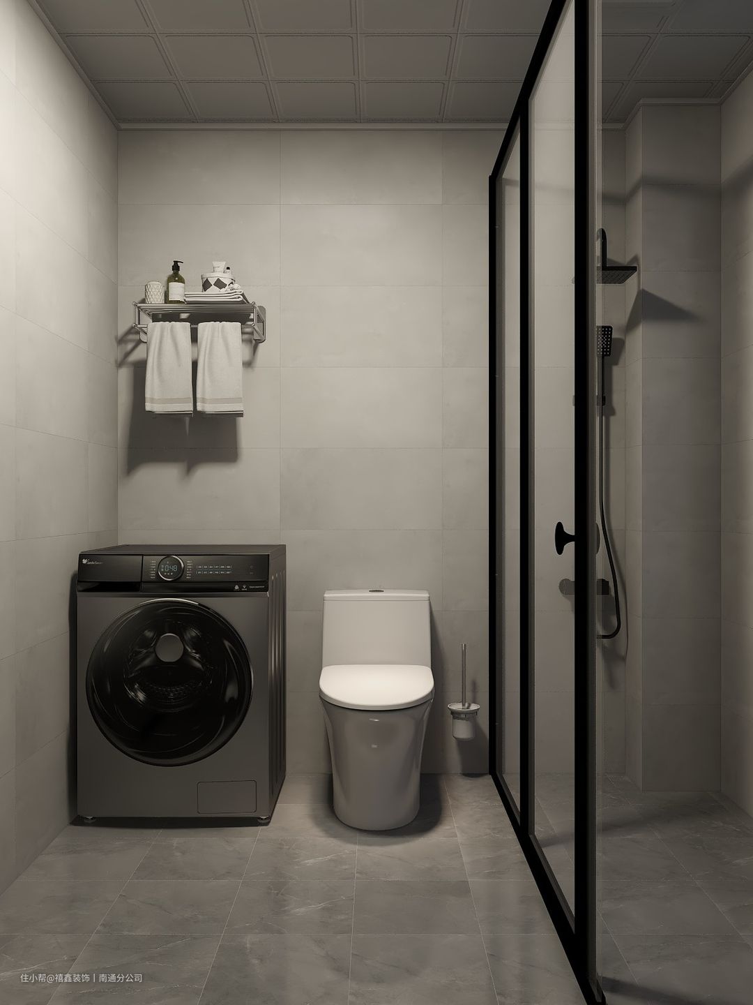 【卫生间】洗手台外置,临近客厅,玻璃隔断增加通透感,悬空设计有利于清洁。卫生间内做了干湿分离设计,空间足够所以洗衣机就放在了马桶旁边,洗漱完就可以将脏衣服放进去洗。