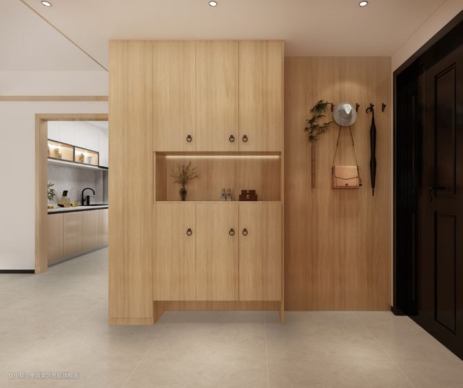 入户右边是一个挂大衣的包括挂雨伞的区域,左手边我们做的是一个洞洞板,放一些钥匙包括一些摆件。