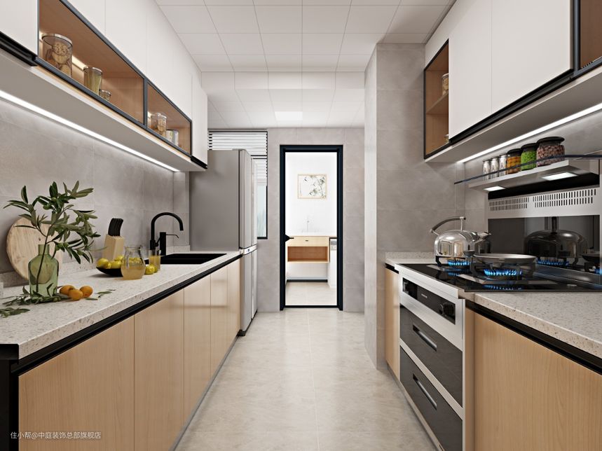 厨房:设计的是一个高低台面,灶台做得稍微低一些,切菜和洗菜盆台面做高一些,这样切菜不用弯腰会比较舒适。