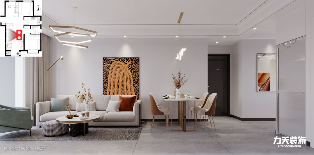 多边形组合吊灯、极简落地阅读灯与金色四头创意吊灯的组合,为客餐厅营造出温馨浪漫的氛围感。