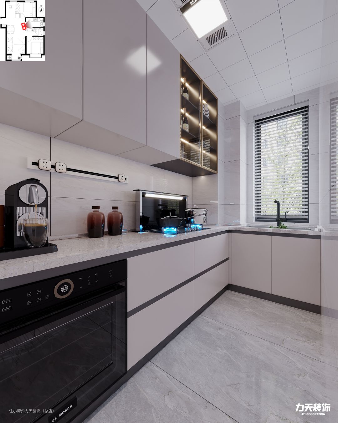 按照现有户型结构,打造L形厨房地柜。台面上方增设储物吊柜,充分利用空间,满足收纳需求。
