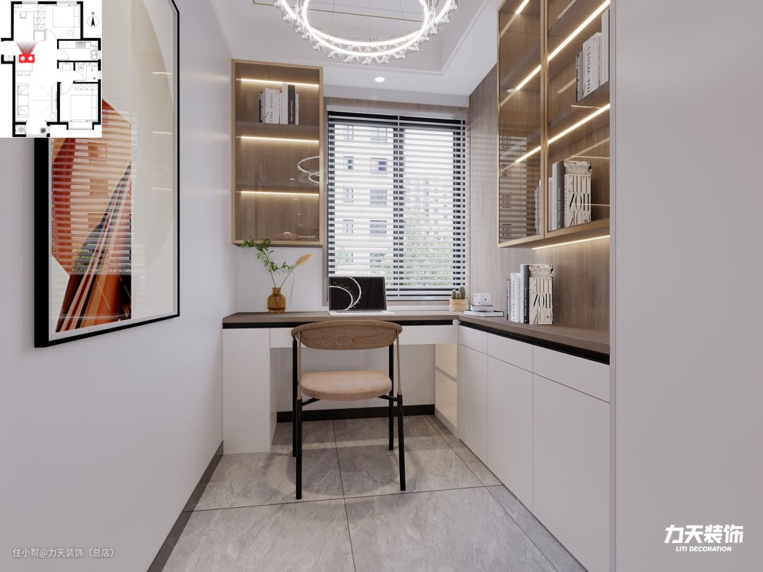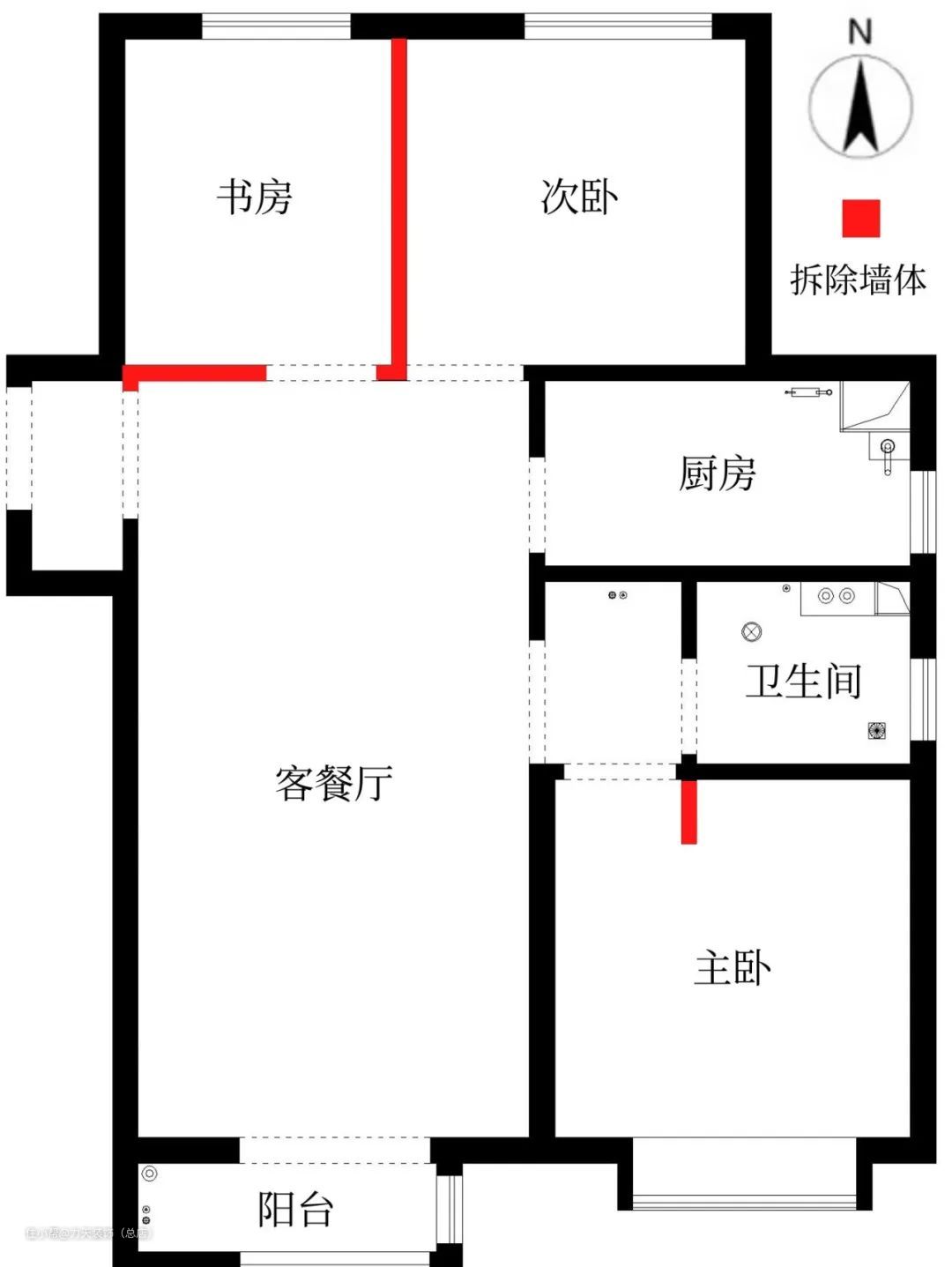结构上,拆除原有书房和次卧之间的隔墙,扩大次卧使用面积。拆除书房入口左侧墙体,打造半开放式书房。并在次卧与书房间预留出冰箱的位置。