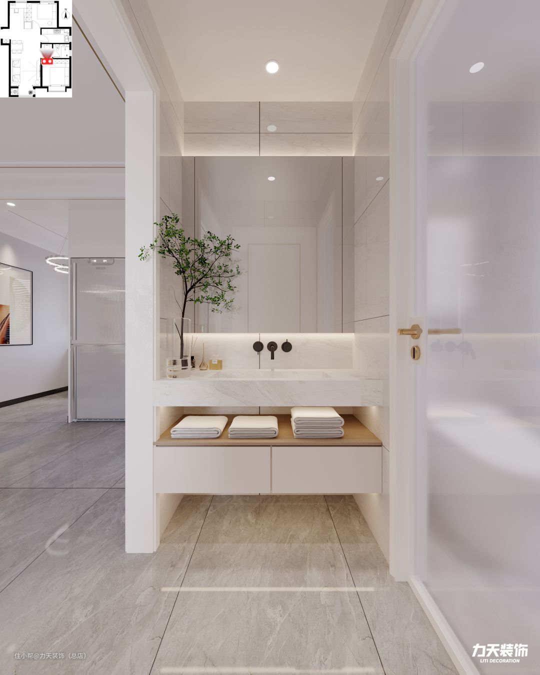 卫生间干区不用传统浴室柜,洗漱台和收纳柜做悬空方式处理,洗漱用品拿取存放更便捷。干净、卫生,还好打理。