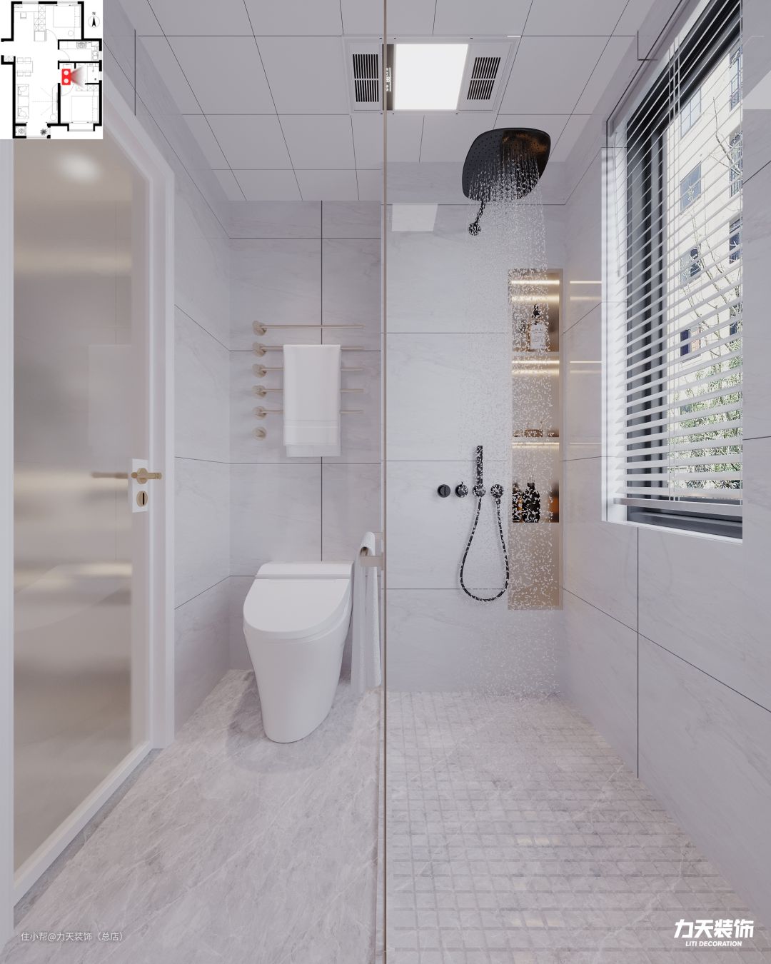 卫生间整体效果极简,使用感受极佳。淋浴区、马桶区由玻璃隔断推拉门一分为二,干湿分离。