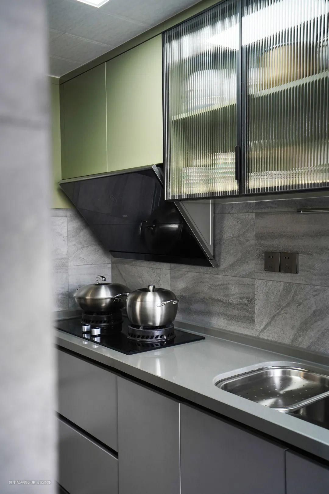 厨房空间深浅色瓷砖交错拼贴,别有趣味。大L型橱柜增加充足的收纳,大理石台面大气且方便打理,长虹玻璃柜门凸显高级气质。#厨房应该怎么装
