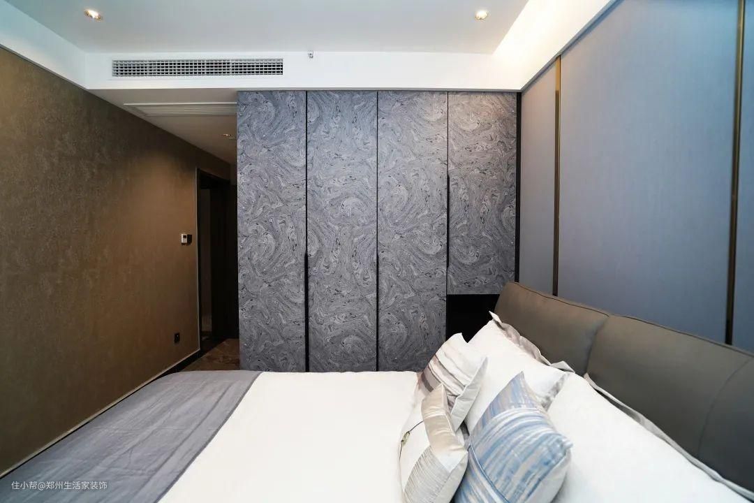 纳帕纹皮普蓝色金属线条背景墙,为空间奠定轻奢的格调,无主灯设计带来柔和淡然的光线,打造舒适静谧的睡眠环境。