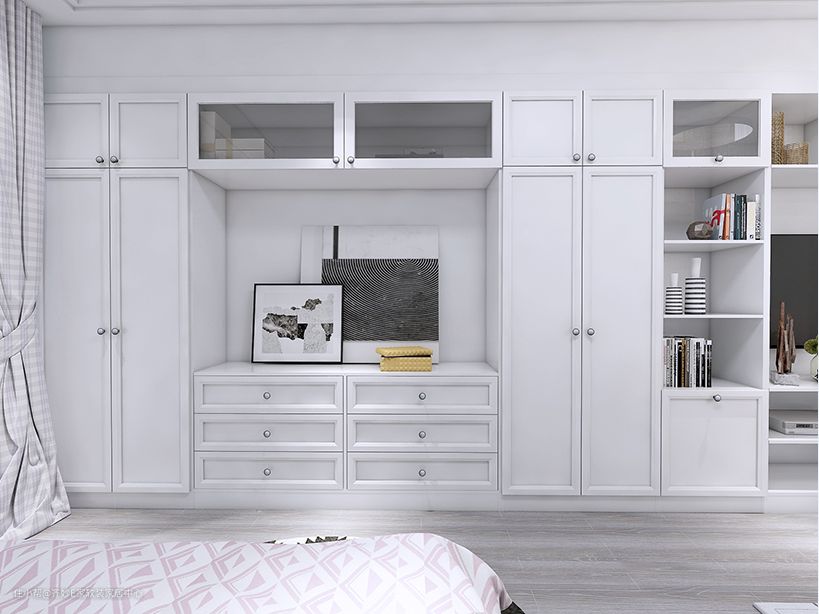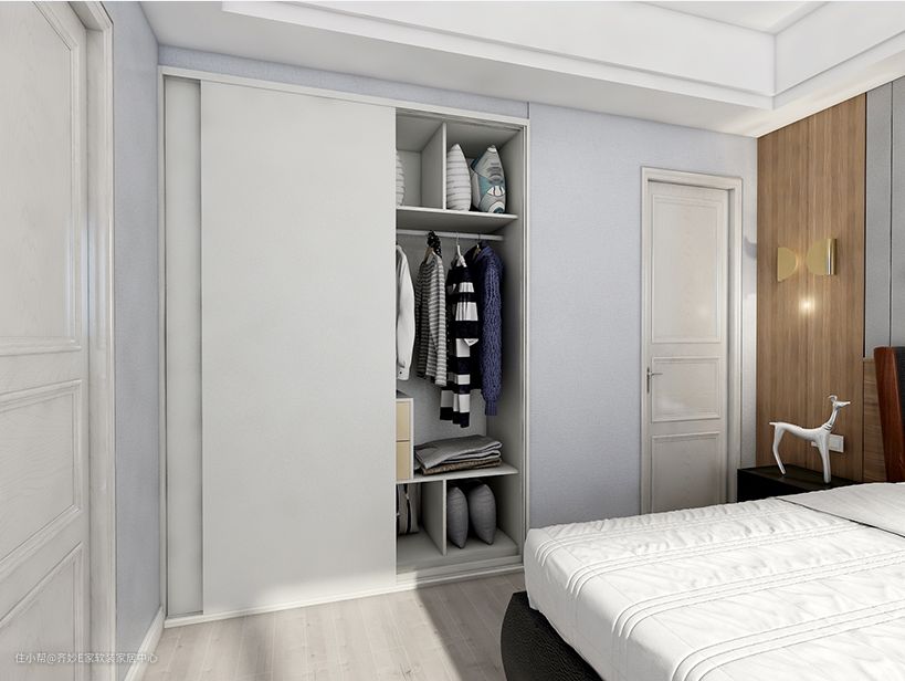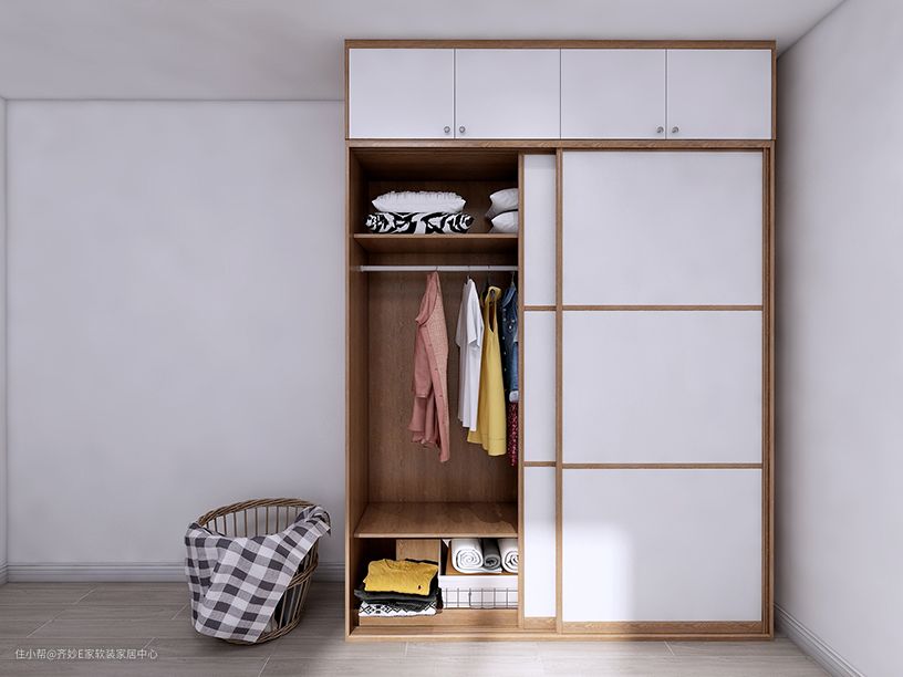 全封闭式设计,能够起到很好的防尘和私密效果。也可以将折角位置做成开放设计,悬挂常穿的衣服,或者存放行李箱,这种方式让空间更通透,取放东西更便捷。不足之处也很明显,就是容易落灰,不过对于勤于打扫的宝宝来说,这都不是事儿~