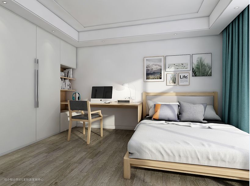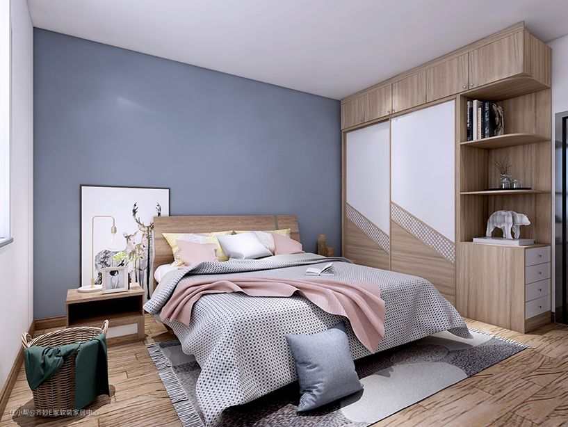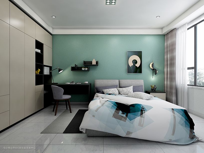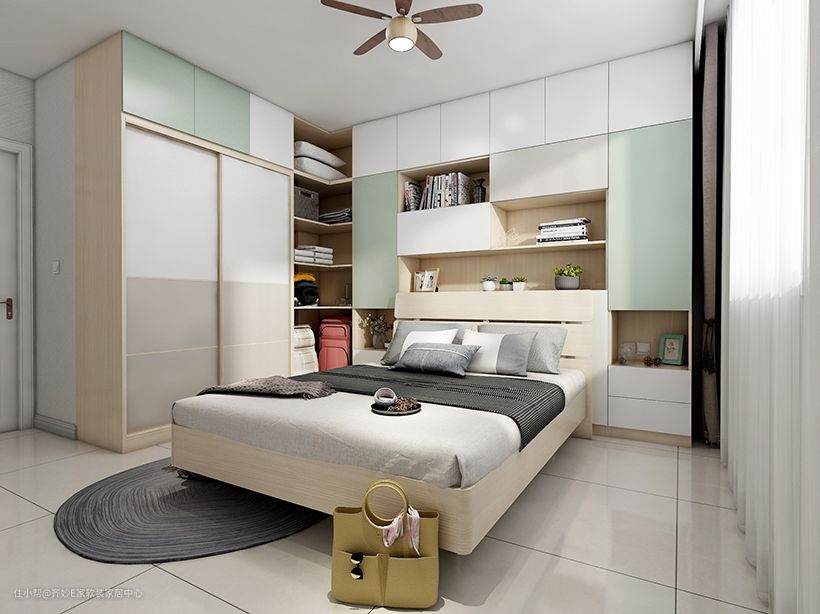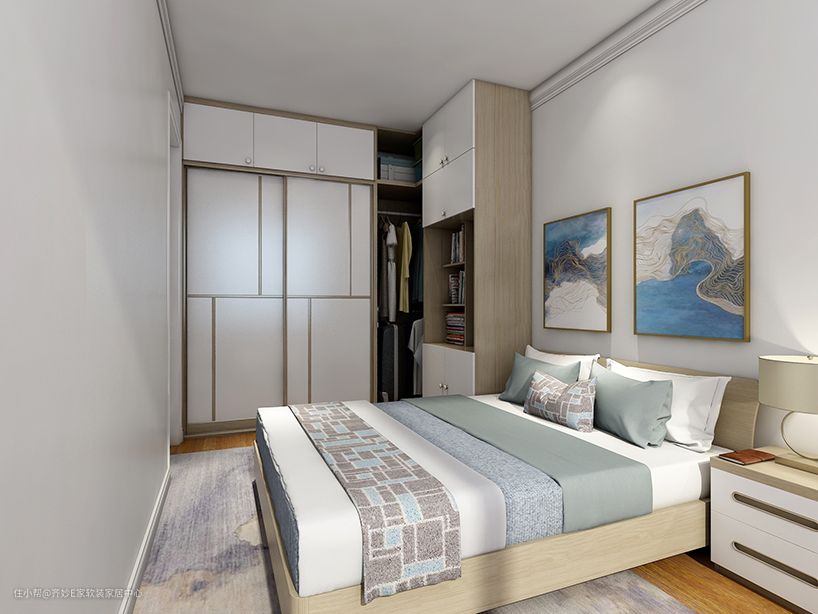 这个几平米的小卧室,衣柜放在了床尾的墙角位置,充分利用了角落空间,因为开口空间宽敞,故而采用了平开门设计。