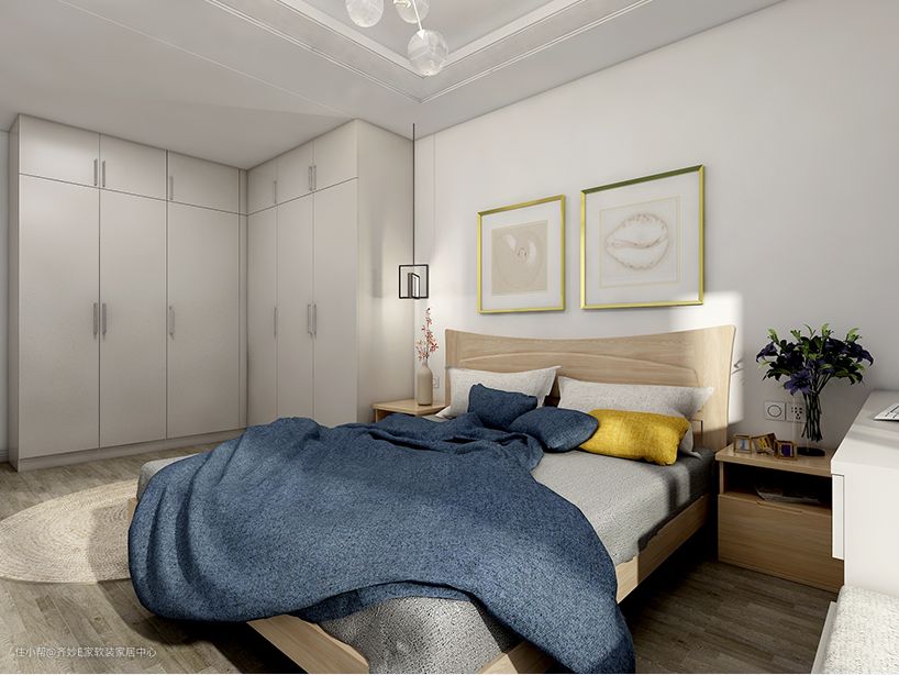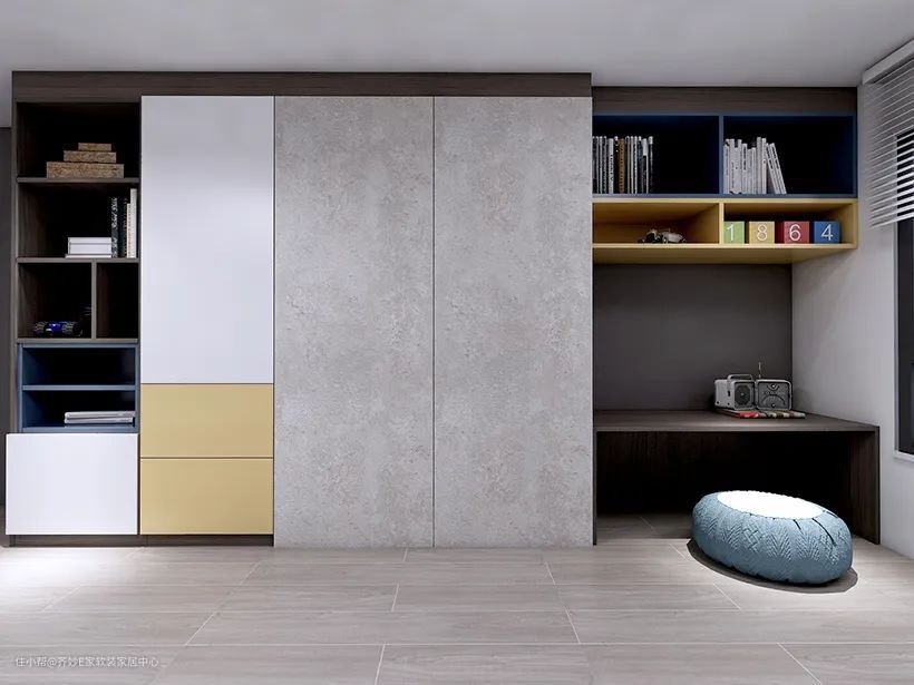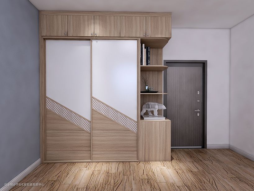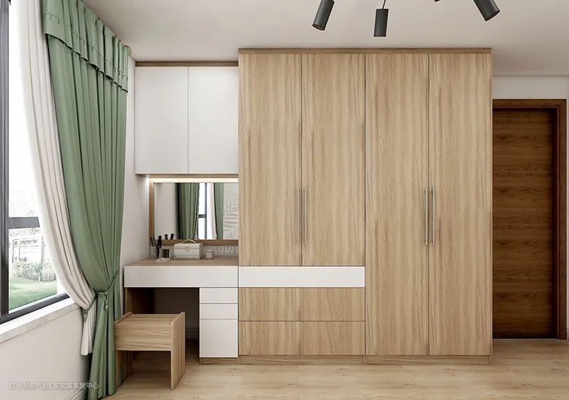这是一组组合衣柜,出自一个建筑面积57㎡的小清新简约风开间,因为采用了内嵌设计,所以放到这里来说,下面小美还会为大家单独讲解组合衣柜的设计。