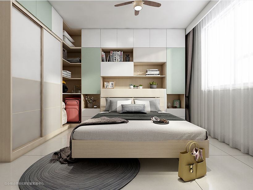 多出来的开放柜,可以摆放家居饰品来提升卧室格调,也可以作为卧室玄关柜使用,悬挂常换洗的衣服、包包和钥匙等物件。