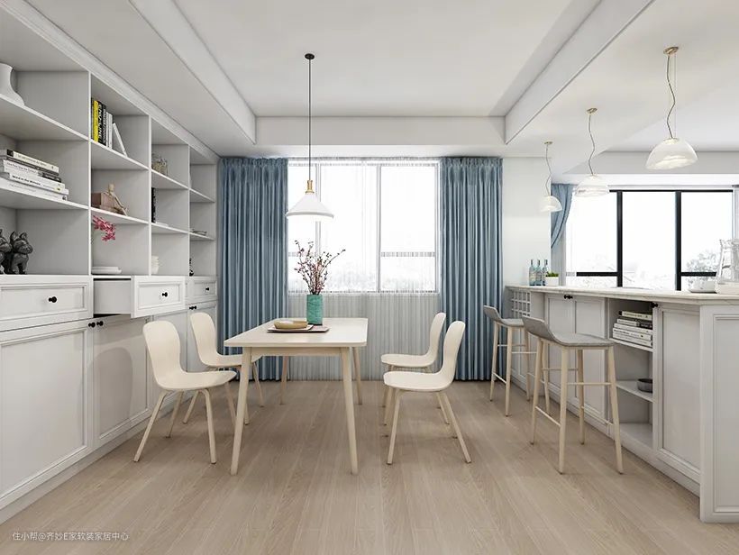 这个案例的开间达到8.2米,不过从图片就能看出它在空间上并不会显得太宽。客餐厅之间通过定制打造了一个吧台柜,作为主要的隔断,平时还可以直接坐在这里看电视。
