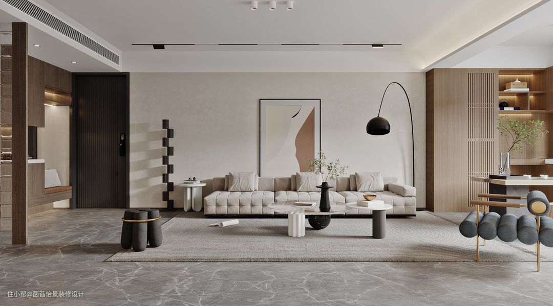 客厅的空间中,做的无主灯的设计,顶部的空间利用线灯与局部的落地灯进行空间氛围营造。打造出一个舒适大气的空间氛围。