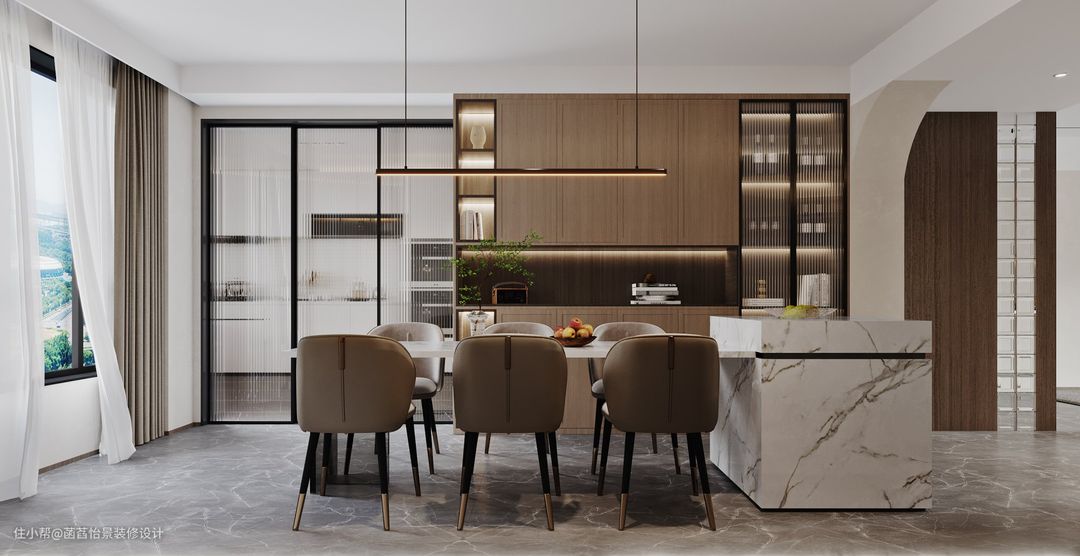 餐厅的区域中,一张石材的餐桌搭配着顶部的吊灯,带来精致大气的用餐氛围,石材的餐桌连接着岛台的设计,更便于日常的使用与操作、