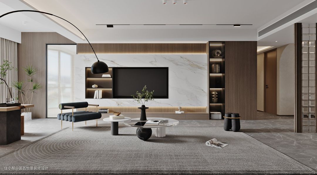 电视背景墙做的白色的石材与格栅板的拼接设计,增加空间的层次感。一侧的区域加入定制的收纳柜,增加空间的收纳性。