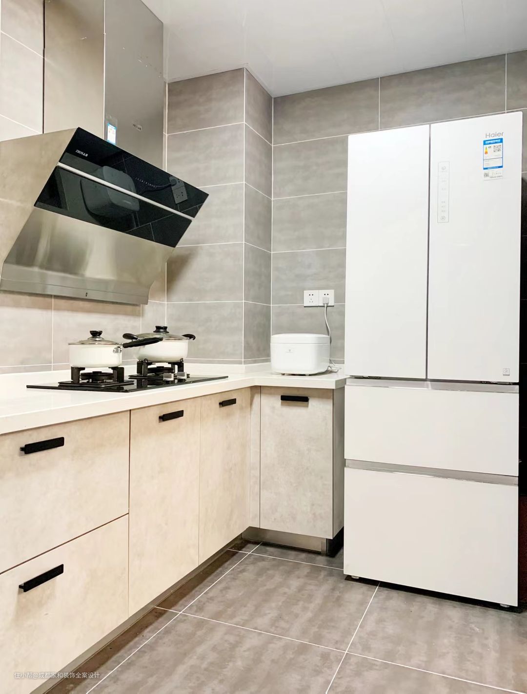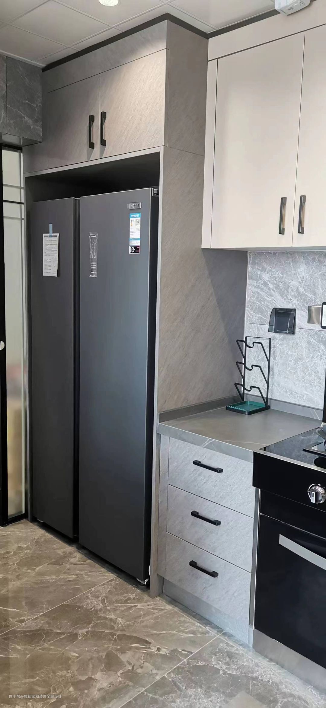 很多人选择将冰箱与橱柜结合,整体感更好,但需要注意冰箱的尺寸与散热问题,橱柜一般在装修前期就会进行测量做出设计图,这时候就要确定好冰箱的尺寸,留出一定的散热空间,否则很容易出现冰箱放不进去或者突出来很多的情况。