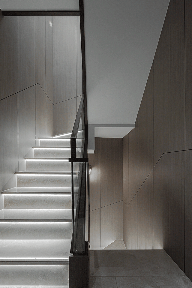 楼梯空间较狭小,把灯具设置在较低的位置向高处照,光线可以扩散到很远的范围,兼顾照明需求外,还减轻空间厚重感,氛围感up。