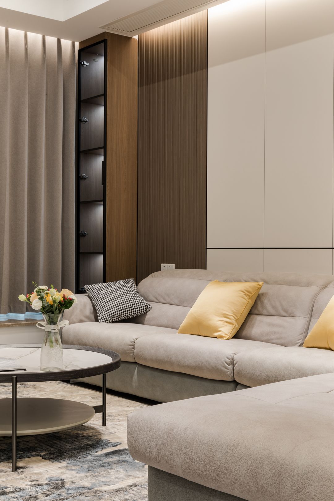 玄关、走廊提前预留开槽位置,将灯带沿着地面或顶部墙角边嵌入,营造回家的仪式感,而且作为空间的照明补充,解决了光线昏暗的问题。