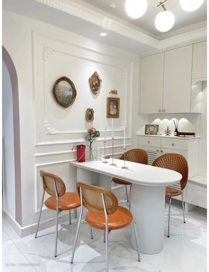 餐厅的面积并不大,但选择一款小巧的餐桌,不管是圆形的,还是长条状的,摆放在这里,都能很合适。不同款式的餐桌,可以给人不一样的就餐体验。