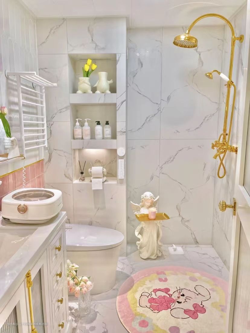 面积4㎡,半墙白色和幻彩羽毛砖比例1:1,150x150 的粉色小方砖,方砖与羽毛砖比例3:2,金色铜条宽度:1cm。