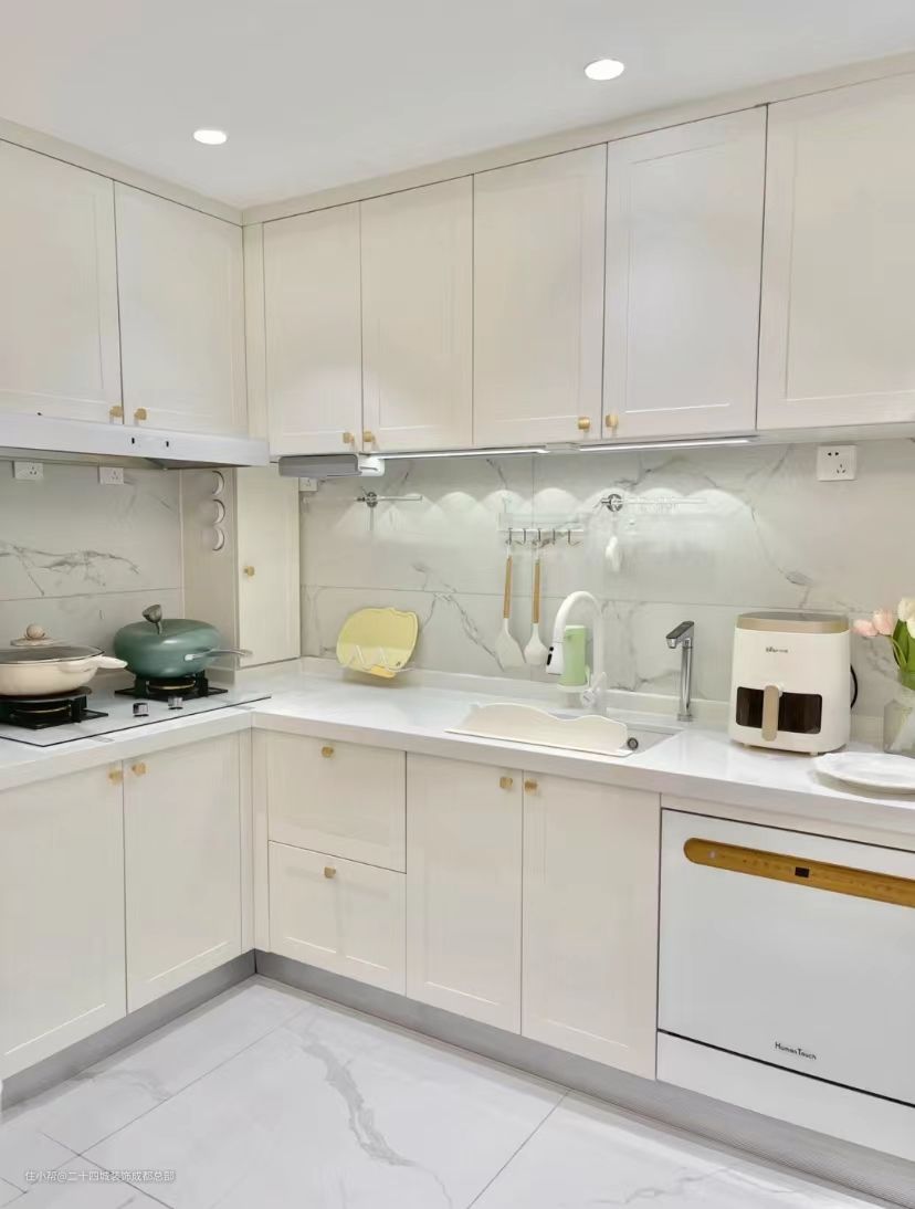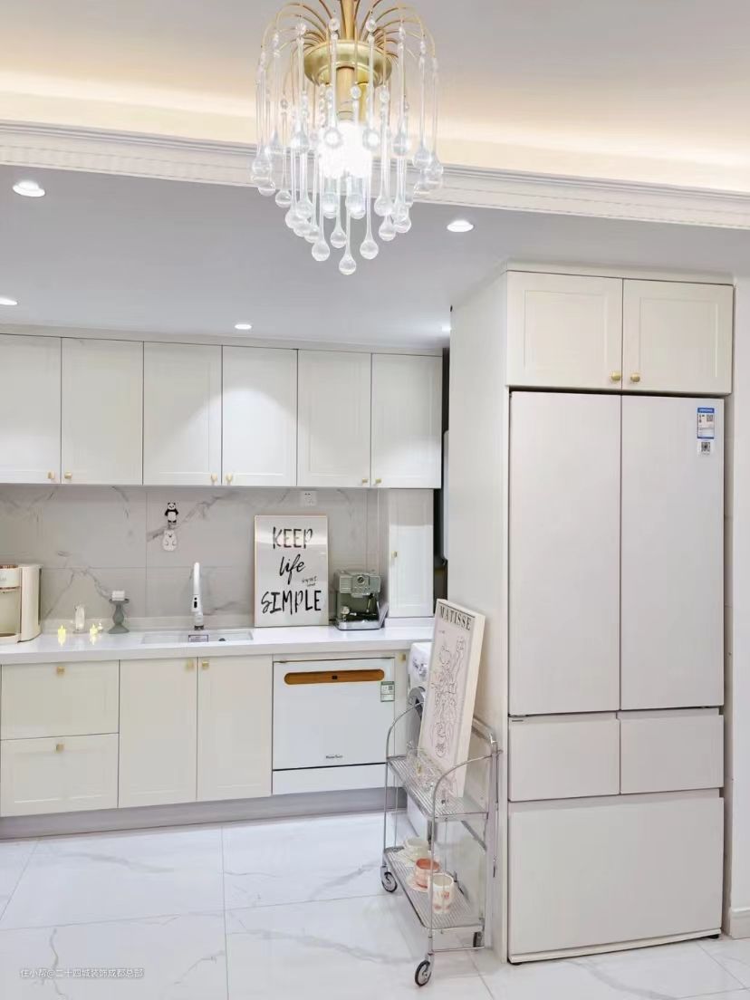 厨房没有窗户,虽然改造成开放式的,在采光和通风上都有了一定的改善,但配合白色系的装修,效果可以更好。