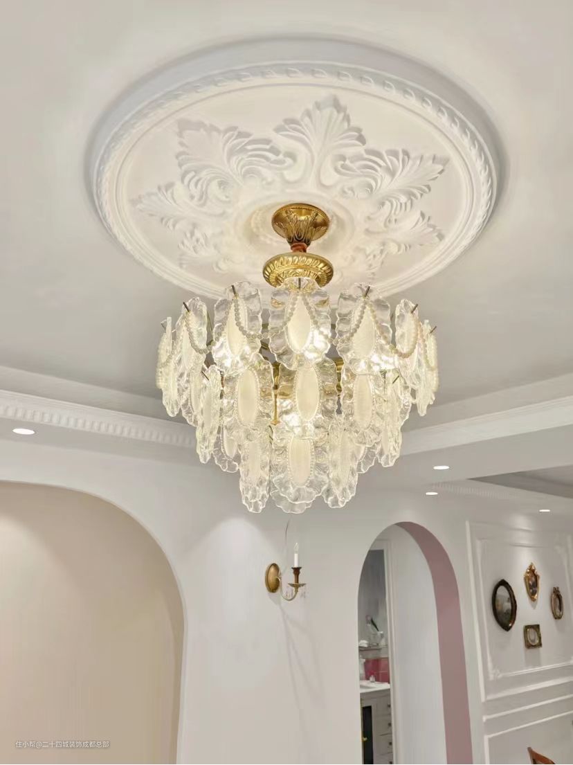 主灯是50cm双层的 珍珠水晶吊灯,七头的光源亮度刚好,还有三色变光。