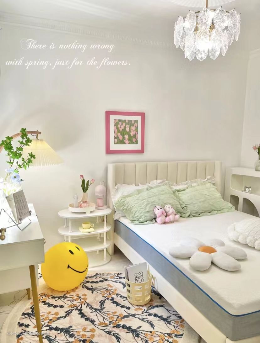 更明亮好搭配软装,床头背景墙半墙珊瑚粉色 其他墙面珍珠白,2cm和4cm石膏线,软装白色系绿色系为主,这样一搭,绿色和粉色效果很惊艳。