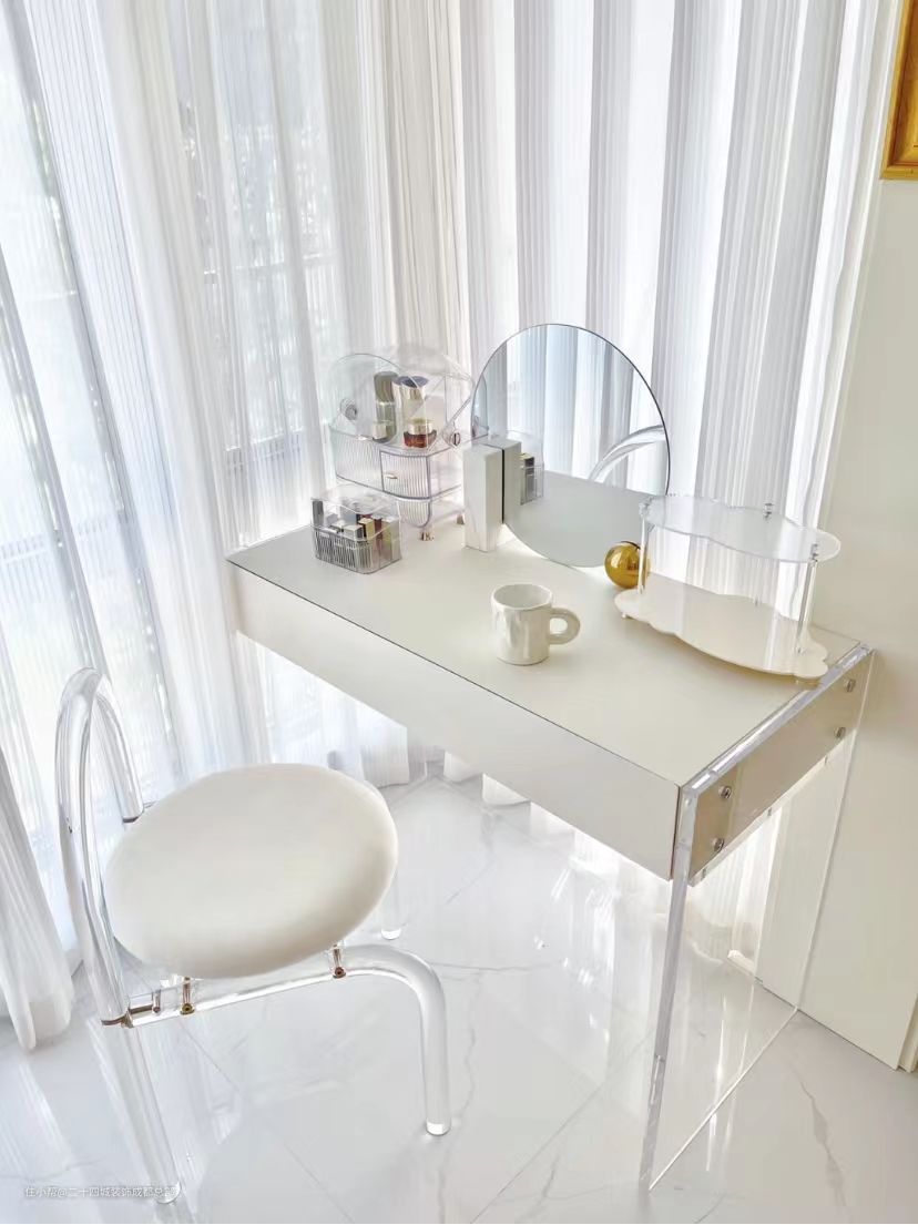 阳台的空间,除了平时的休闲功能外,增加了一款小巧的梳妆台后,还兼顾了梳妆间的功能。奶白色的亚克力梳妆台,透明亚克力桌腿的设计好像悬浮了起来,视觉空间也显大。