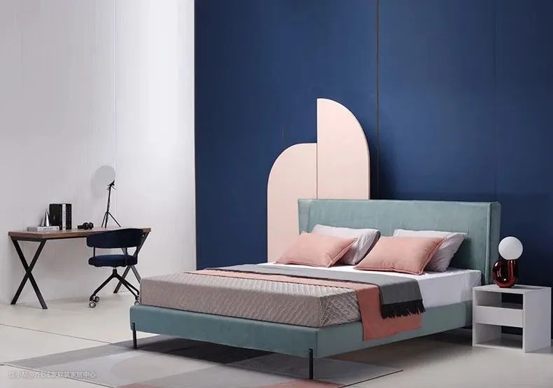 ▲ 不需要大面积地使用粉色,有时候只需要一个靠包的点缀就能让空间绽放别样的魅力。绒面质地的粉色靠包与灰蓝色双面绒布艺软床搭配,与蒂芙尼蓝和粉色的经典搭配相比,在甜美之中更多了几分柔美与平和,同时光泽感十足的布艺还为空间增添了轻奢气质,让卧室更显高级。