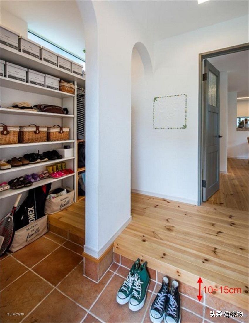 多数日本住宅内,入户旁侧都会设立独立的“土间收纳”空间。这样设计一方面是为了划分行走动线,另一方面是为了扩增玄关区的收纳容量。