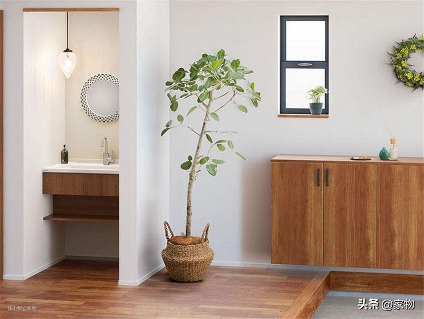 在日式家居中,玄关处装洗漱台非常常见。因为房间内已经做了抬高设计,即便多拉一条水管也能藏在地板内,不破坏空间整体性和颜值。进门洗手,确保干净卫生,尤其是在疫情当下,这样设计似乎更人性化。
