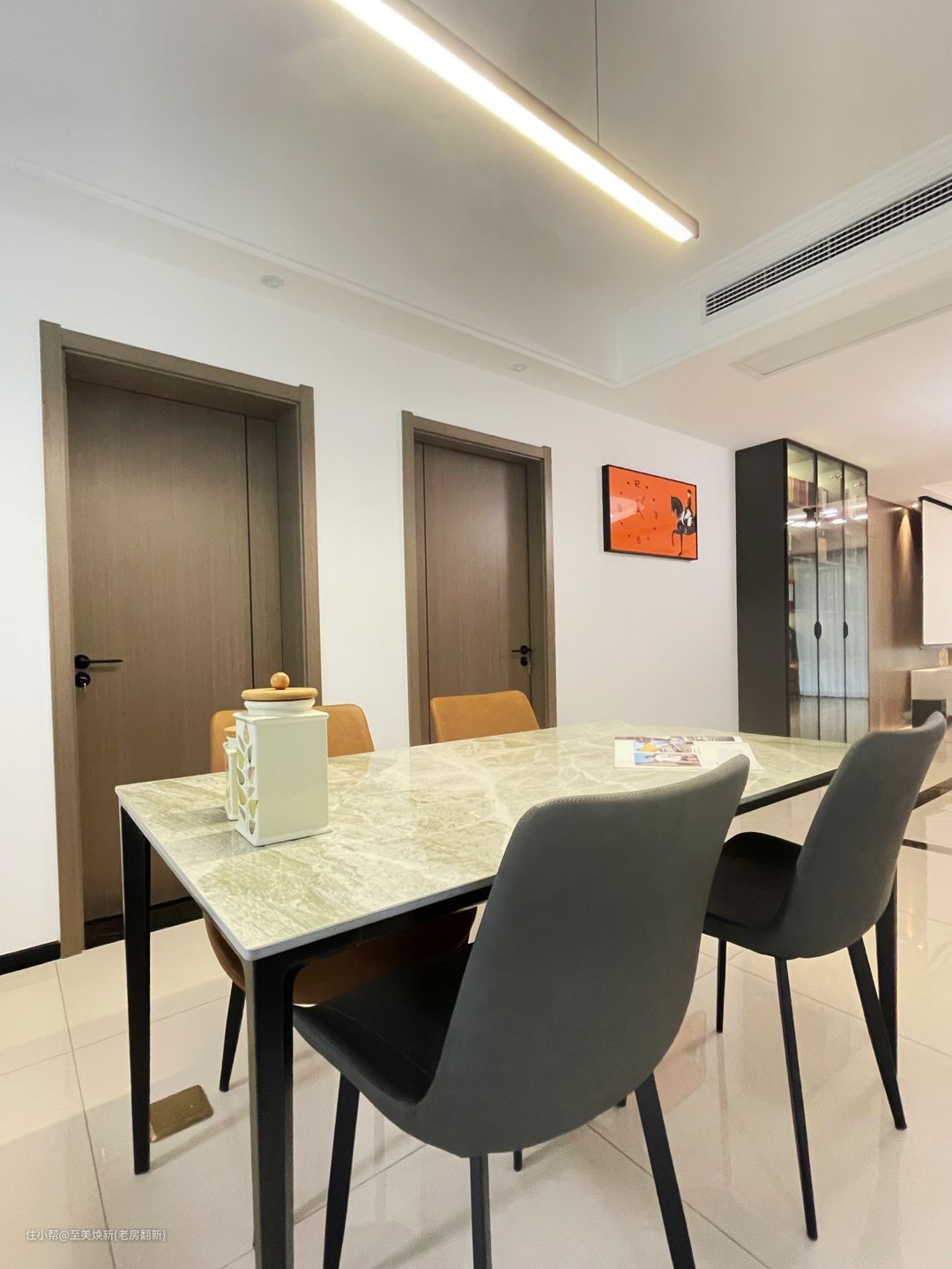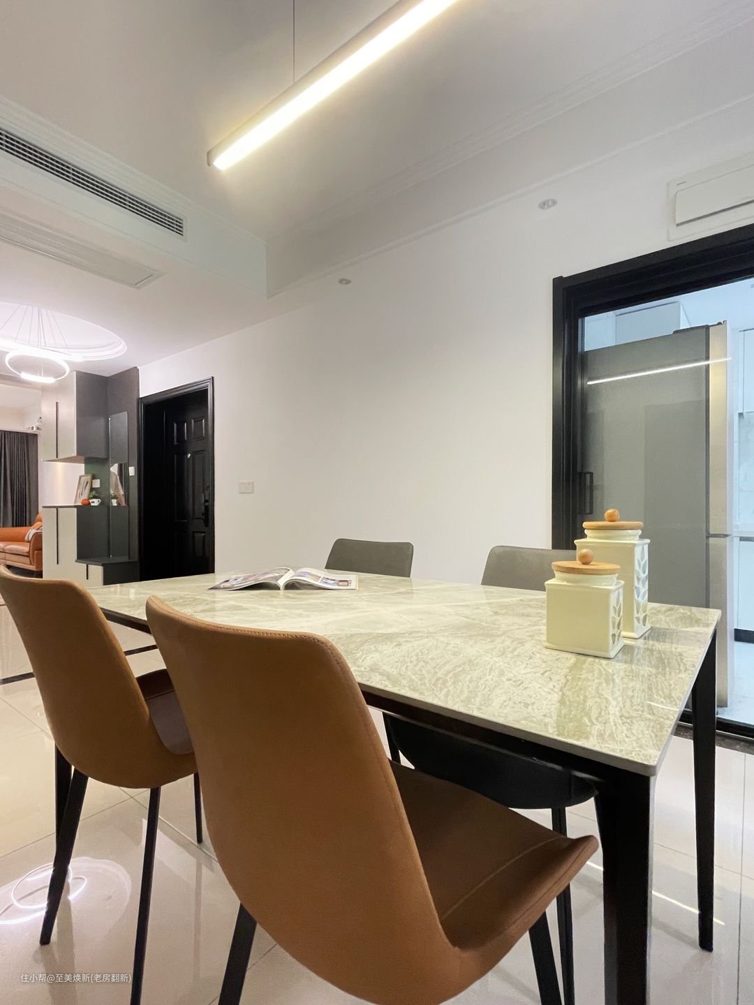 改造后的餐厅完全开放式,餐桌椅的选择更加的简约,在色彩上和整个空间属于同色系,和整体的风格更加的融合。