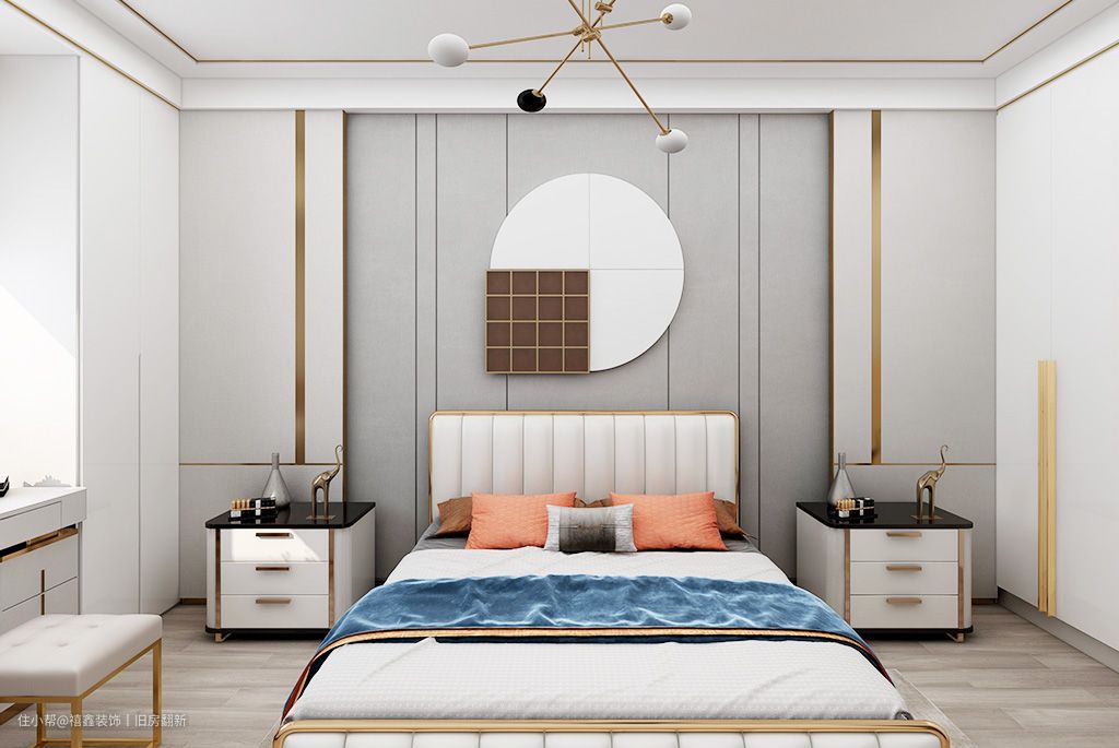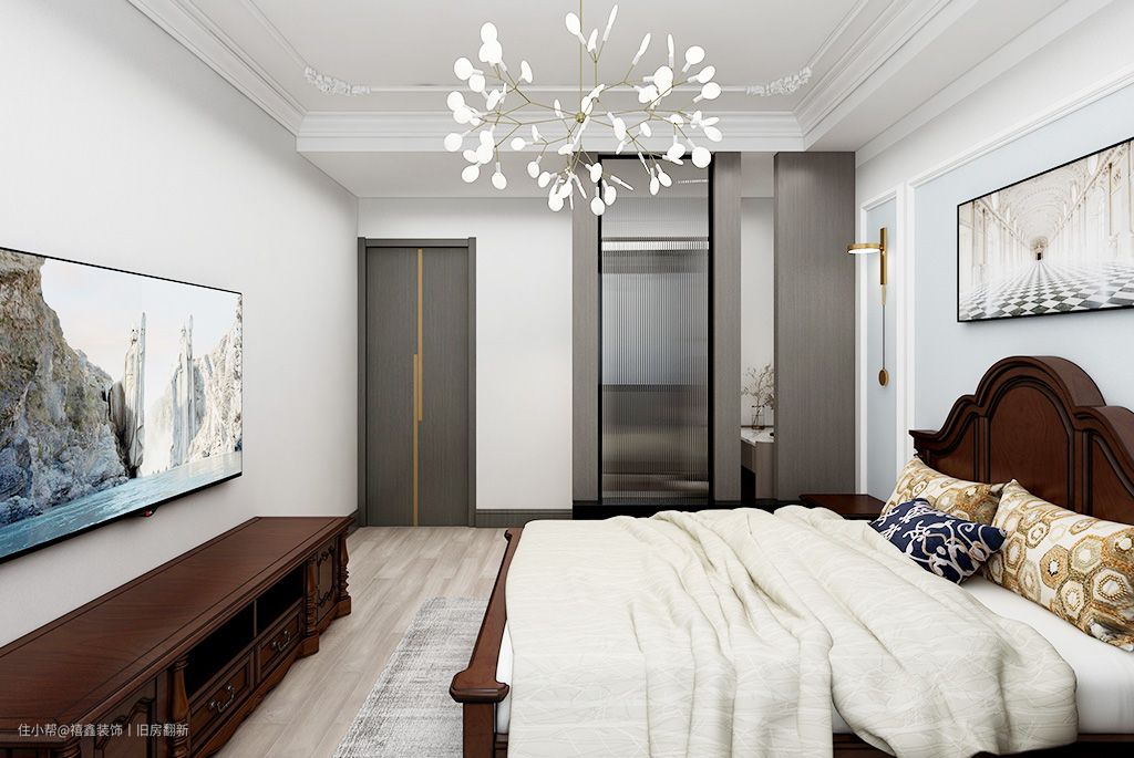 【主卧】主卧作为夫妻俩的房间,利用金属元素延续轻奢的格调,红木材质的家具,透出沉稳的气息,将主卫与衣帽间容纳在主卧内,方便业主夫妻夜间起夜,长虹玻璃门的设计,保留了透光性,背景墙利用石膏线作为装饰,浅浅的蓝色,搭配金属壁灯,淋漓尽致地流露出优雅独特的空间魅力。