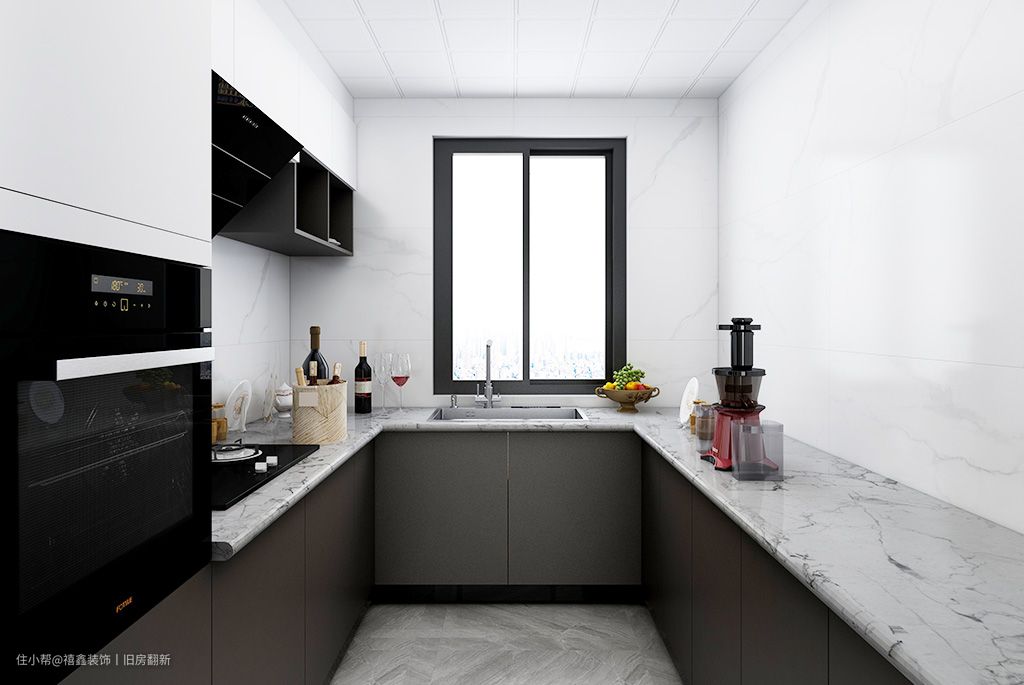 【厨房】厨房狭长,采用咖色与咖色搭配大理石贴砖,低饱和色彩感让人舒适与放松。因为家的储物空间足够,另一侧的操作台专门用来备菜,放置小型电器。