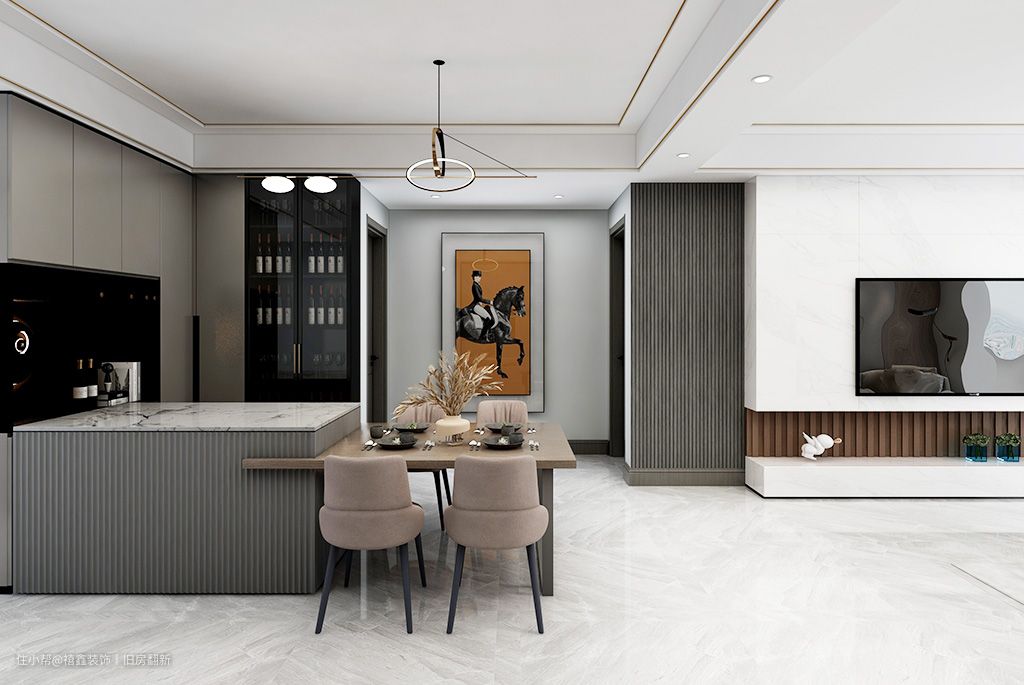 【餐厅】浅咖色丝绒餐椅搭配简约金属吊灯,与客厅氛围相融合,以轻奢感塑造了每天的用餐仪式感。因为业主喜欢做西餐和面包的,一个兼顾收纳功能的中岛台,正好可以作为料理台使用。采用,颜值与实用性俱佳,充满小资情调。