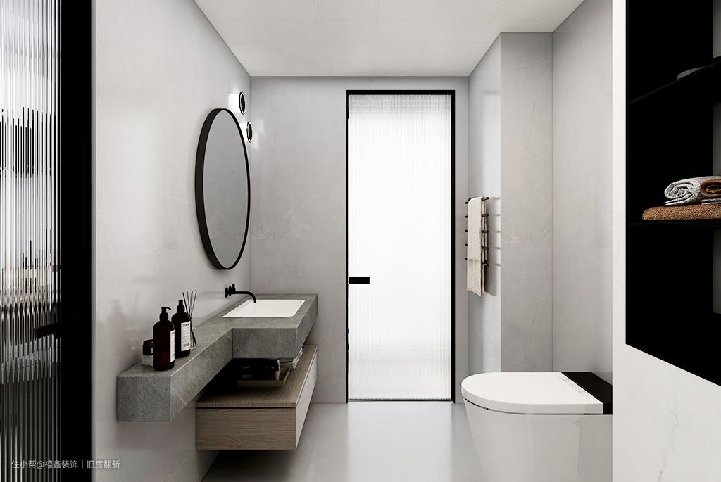 【卫生间】深灰色的台面与浅灰色的墙砖搭配,延伸出的台面用来放置香薰等小物件,干湿分离的设计,完美利用墙面空间,设置壁龛放置物品,兼具实用性和美观性。