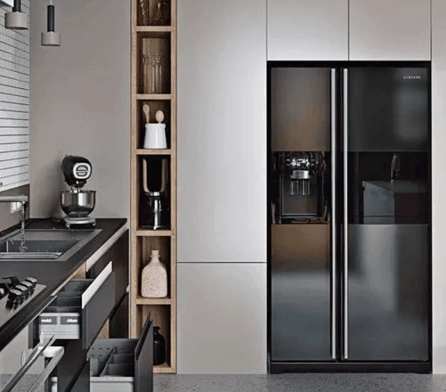 真正的嵌入式冰箱需要定制面板,把冰箱和橱柜衔接在一起,两边不需要预留空间,与柜子合为一体,提高空间利用率。